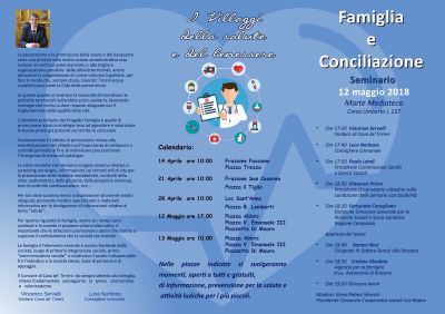Inoltre, il 12 maggio, alle ore 17:30 è previsto un seminario sul tema” Famiglia e Conciliazione” che si terrà presso la Mediateca Marte, cui parteciperanno il Sindaco Vincenzo Servalli, il Consigliere comunale, promotore del progetto, Luca Narbone, la Presidente della Commissione comunale Sanità e Servizi Sociali, Paola Landi, il Presidente dell’Osservatorio cittadino sulla condizione delle persone con disabilità, Vincenzo Prisco, la Dirigente Politiche Sociali e Socio Sanitarie della Regione Campania, il Dirigente del III Settore Servizi alla Persona del Comune, Romeo Nesi, la Responsabile dell’Agenzia per la famiglia della Provincia autonoma di Bolzano, moderatrice Elena Palma Silvestri, Presidente Consorzio Cooperative sociali “La Rada”.